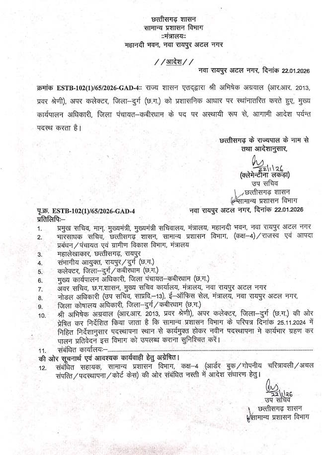 नियुक्ति: दुर्ग अपर कलेक्टर अभिषेक अग्रवाल बने कबीरधाम जिला पंचायत के मुख्य कार्यपालन अधिकारी